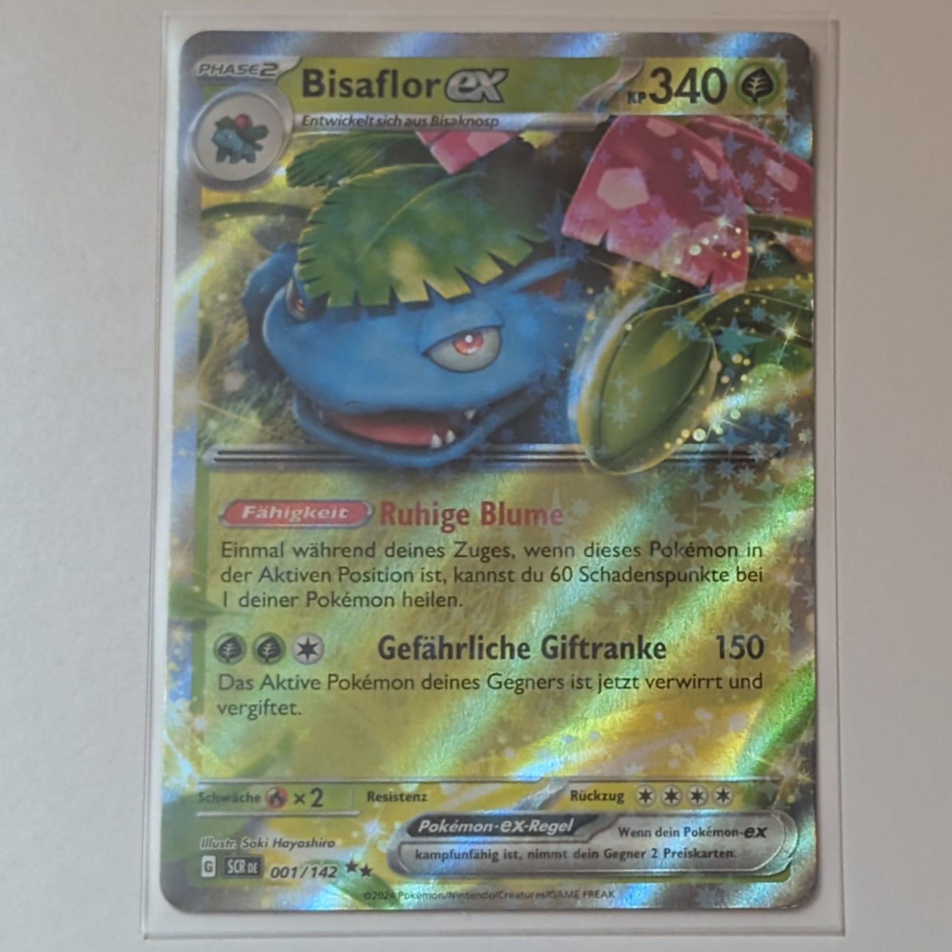 Ein echter Klassiker unter den Starter-Pokémon in beeindruckender EX-Form! Diese Secret Rare Karte glänzt mit atemberaubendem Holo-Effekt und massiven 340 KP. Die Fähigkeit Ruhige Blume sorgt für Heilung, während die Attacke Gefährliche Giftranke nicht nur Schaden anrichtet, sondern den Gegner auch verwirrt und vergiftet.