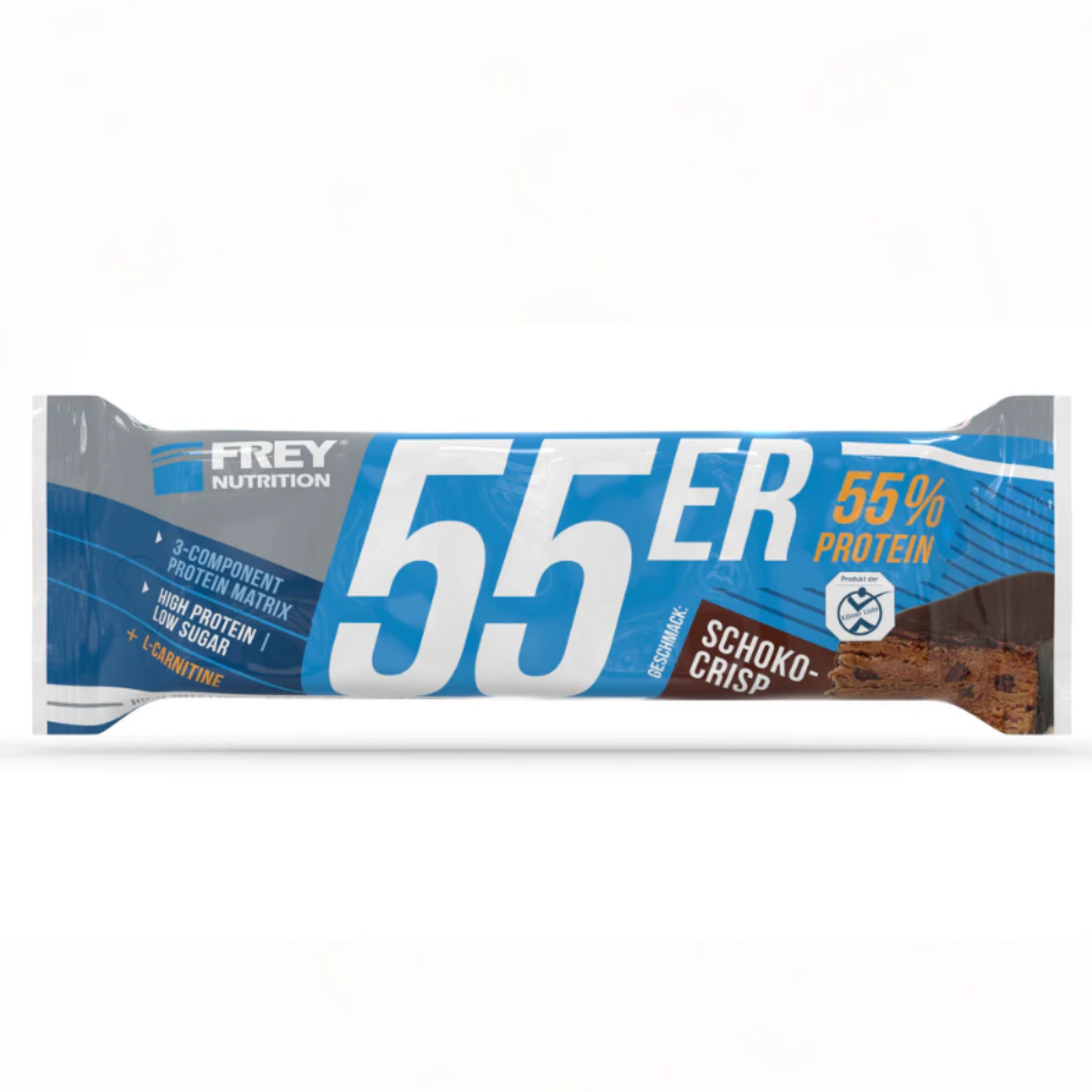 Der 55er ist die neueste Revolution in der Riegel-Forschung und vereint als Mehrkomponenten-Proteinriegel hochwertige Zutaten, einen hohen Proteingehalt und einen geringen Zuckeranteil mit einem einmalig leckeren Geschmack. Im 55er kommen nicht nur ernährungsphysiologisch sinnvolle Zutaten zum Einsatz, sondern gleichfalls hochwertige Proteinkomponenten mit Verzicht auf künstliche Vitaminzusätze. So erzielt die enthaltene Proteinmatrix aus Milch-, Molken- und Sojaprotein-Isolat nicht nur einen unglaublich hohen Proteingehalt von bis zu 55 %, sondern auch eine außerordentliche biologische Wertigkeit von 126. Der 55er enthält pro Riegel weniger als 1 g netto Kohlenhydrate (net carbs) und ist besonders für eine kohlenhydratreduzierte Ernährung geeignet. Ob nach dem Training, für Zwischendurch oder als leckere Nascherei ohne schlechtes Gewissen, der 55er ist zu jeder Zeit geeignet, indem er für einen zuckerarmen und eiweißreichen Proteinschub sorgt!
